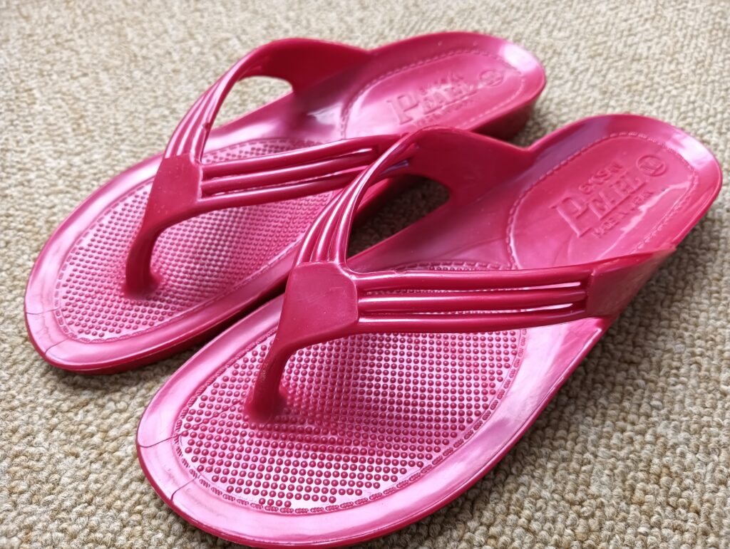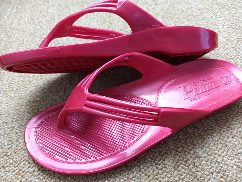 お店に着くと、ビーサンに負けず劣らずの色展開で「シルバーがカッコいいな、クリアブラックもお洒落!、グリーンも可愛いな」と悩む時間も楽しく、これから数年間お世話になる室内履きをじっくり選んだ末に決めた色は、「パールレッド」