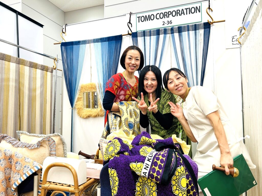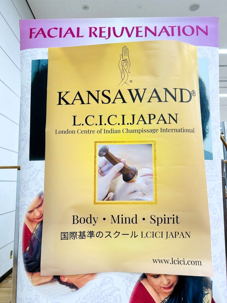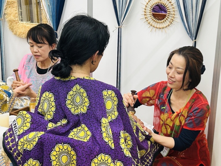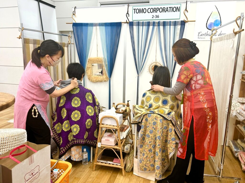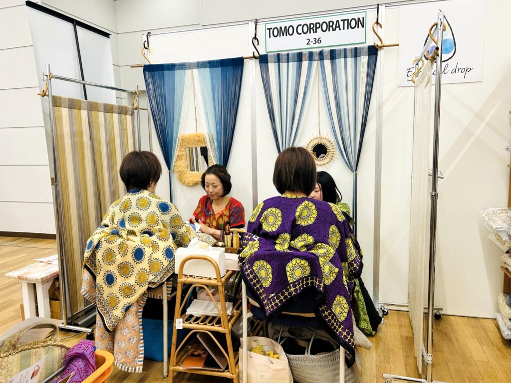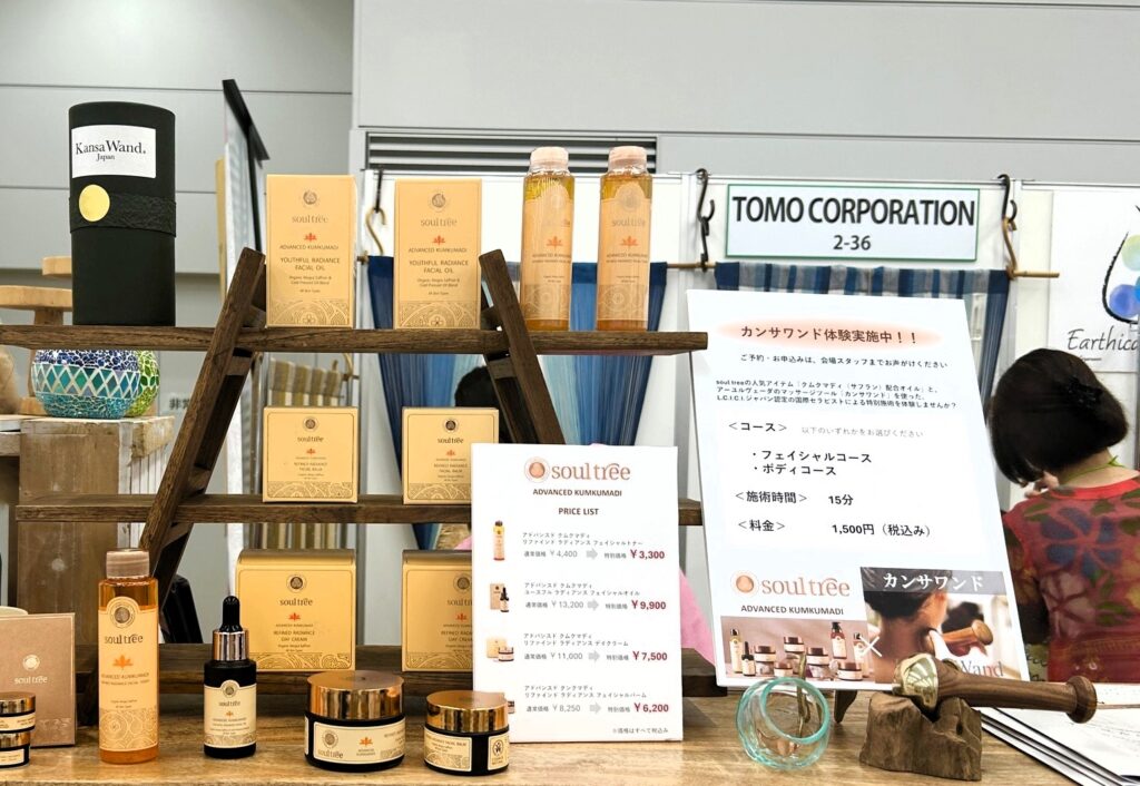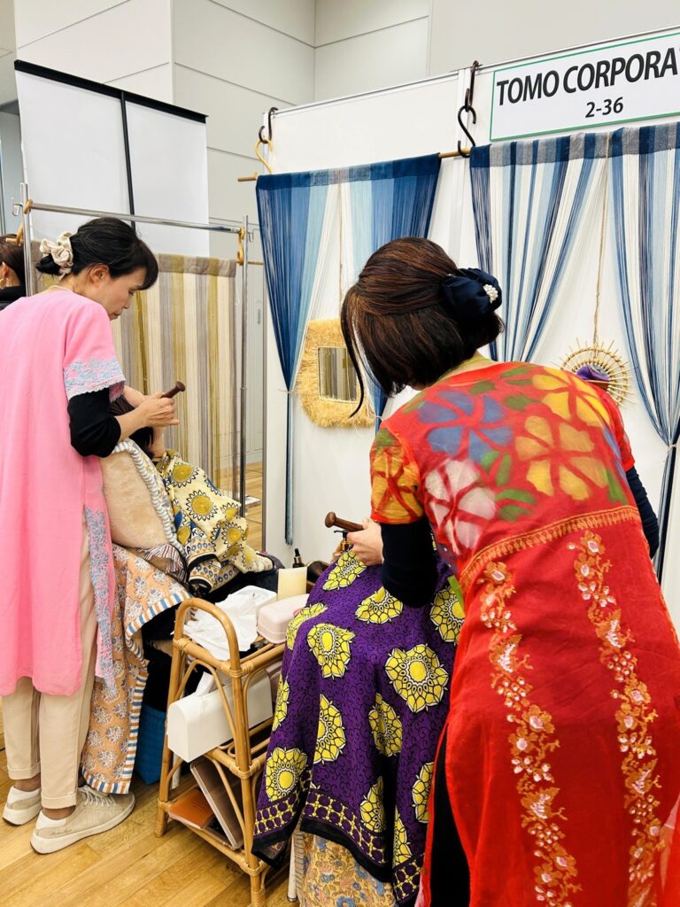 会場はどこも熱気に包まれる中、輸入雑貨専門の卸売り会社「トモ・コーポレーション」さんのアイテムで仕上げらたブースでのLCICIJAPANによるカンサワンド体験の場は、まるでサロンのような雰囲気に