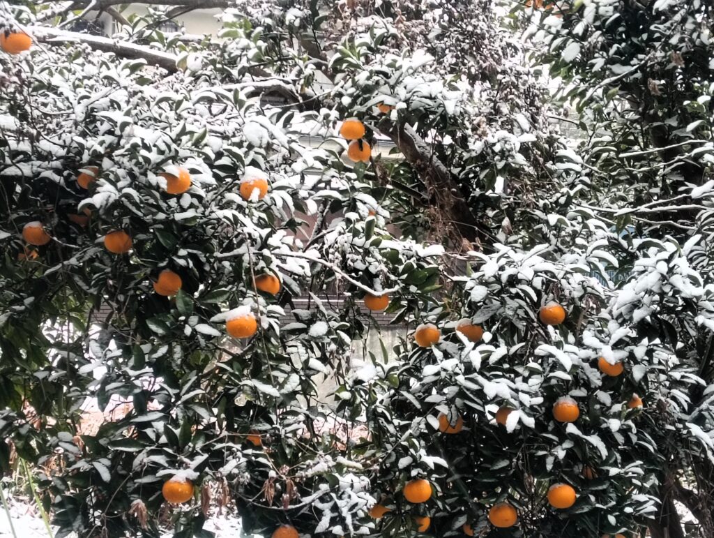 夏みかんの上に白砂糖が振りかけられているみたいで美味しそうであり、元気をもらえるビタミンカラーのオレンジが引き立ってとても美しい