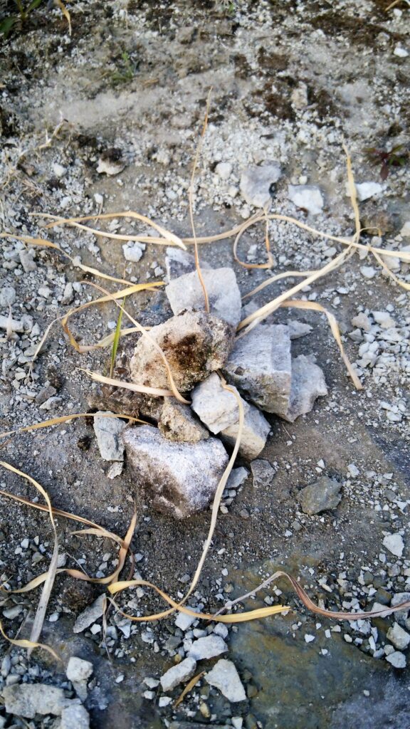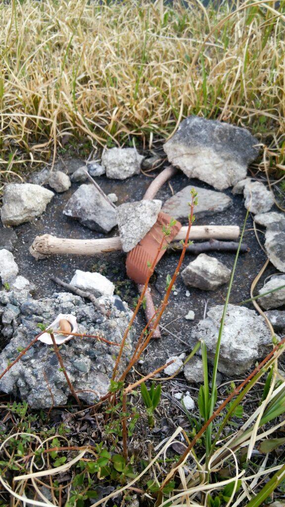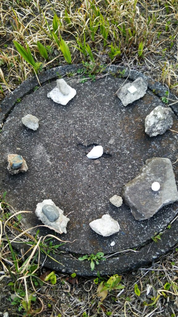 当時7歳だったSちゃんと近所の空き地で遊んでいた時のこと、一生懸命何かしているな~と思っていたら、そこにあるもので(葉っぱや石)、ぱぱっと次々にストーンサークルのようなものが生み出されているではありませんか!