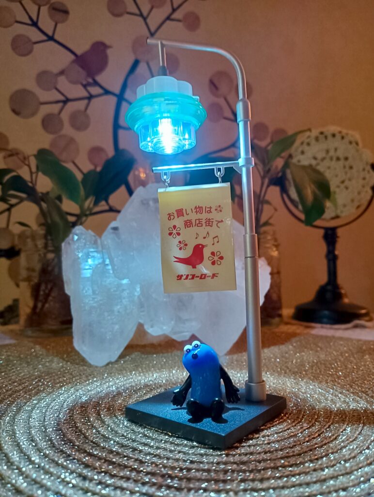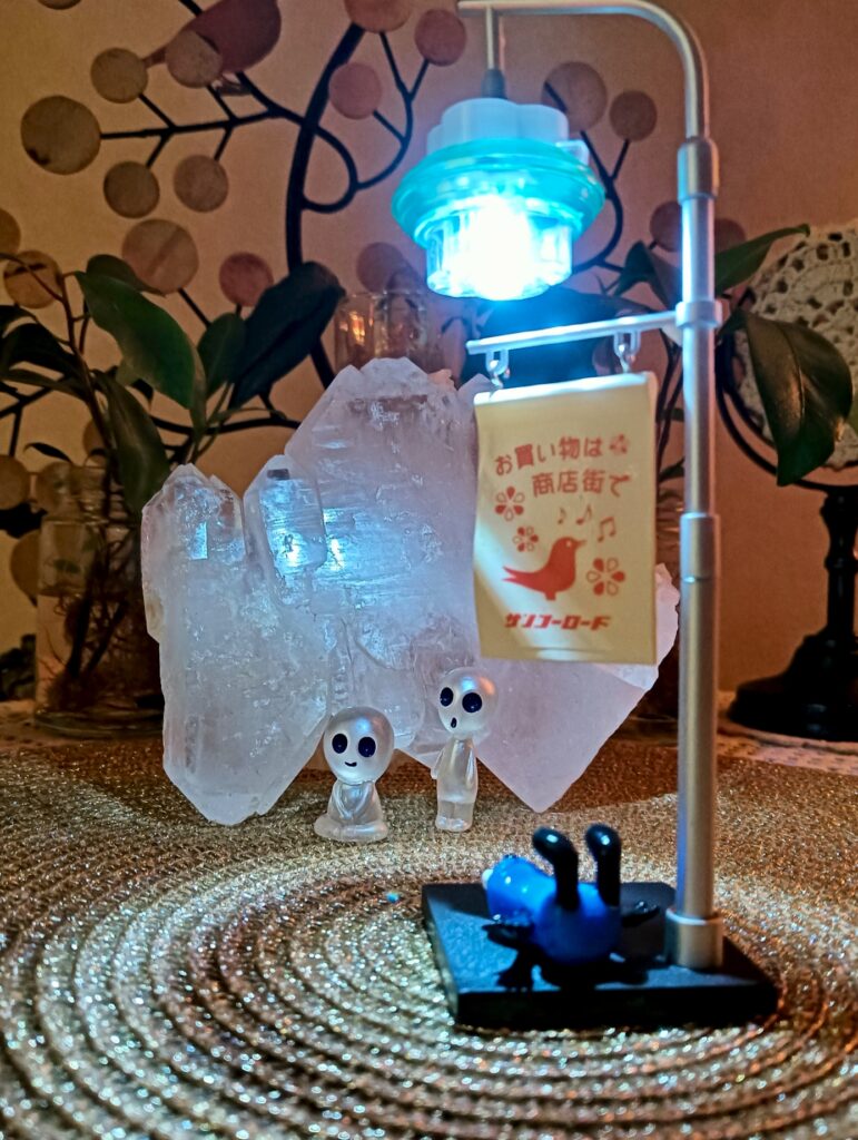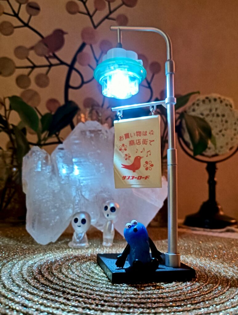 ちょうどライトを点ける時間に相応しく、電池のある内に(電池交換不可商品ゆえ)明かりが灯る姿を写真に収めようと思い、途中で木霊ちゃんも登場させたら