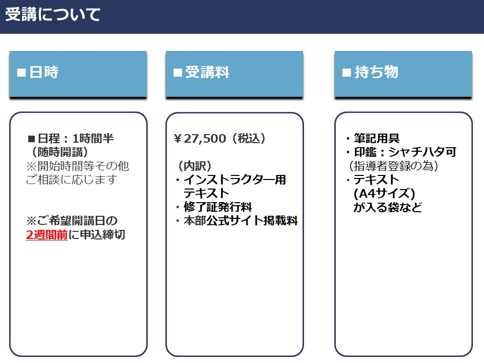 ご希望受講日の2週間前までにWEBまたはお電話(090-3960-9764)にてご連絡ください