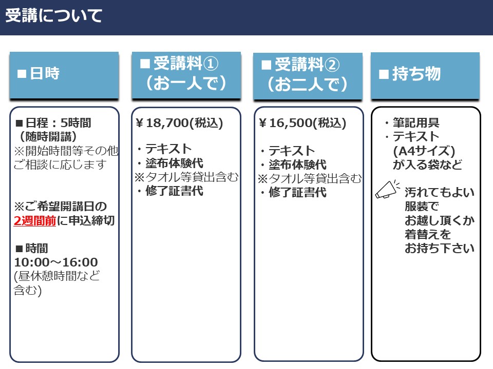 ご希望受講日の2週間前までにWEBまたはお電話(090-3960-9764)にてご連絡ください