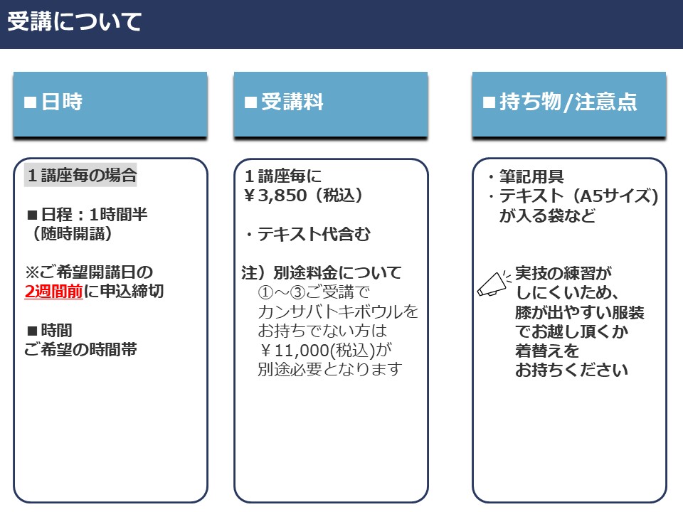 ご希望受講日の2週間前までにWEBまたはお電話(090-3960-9764)にてご連絡ください
